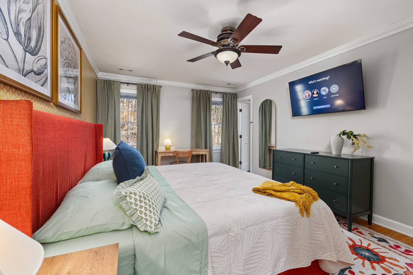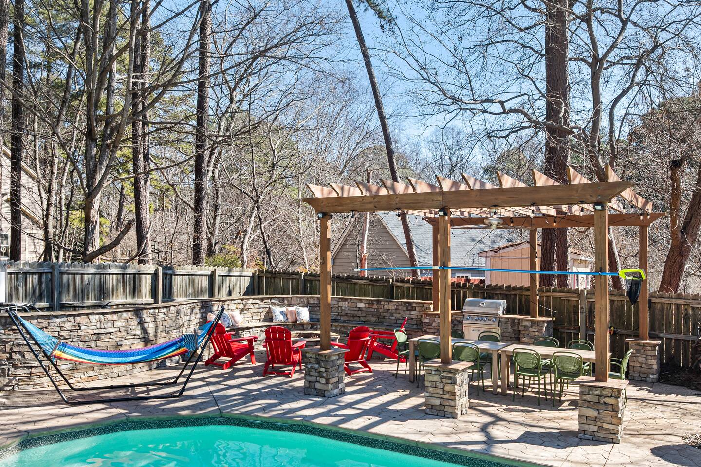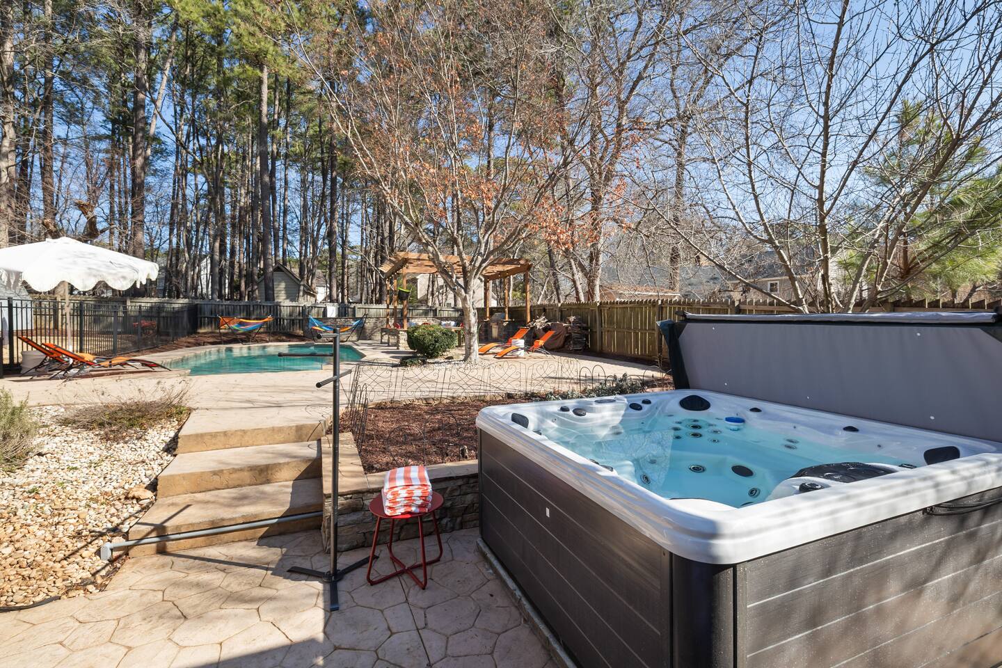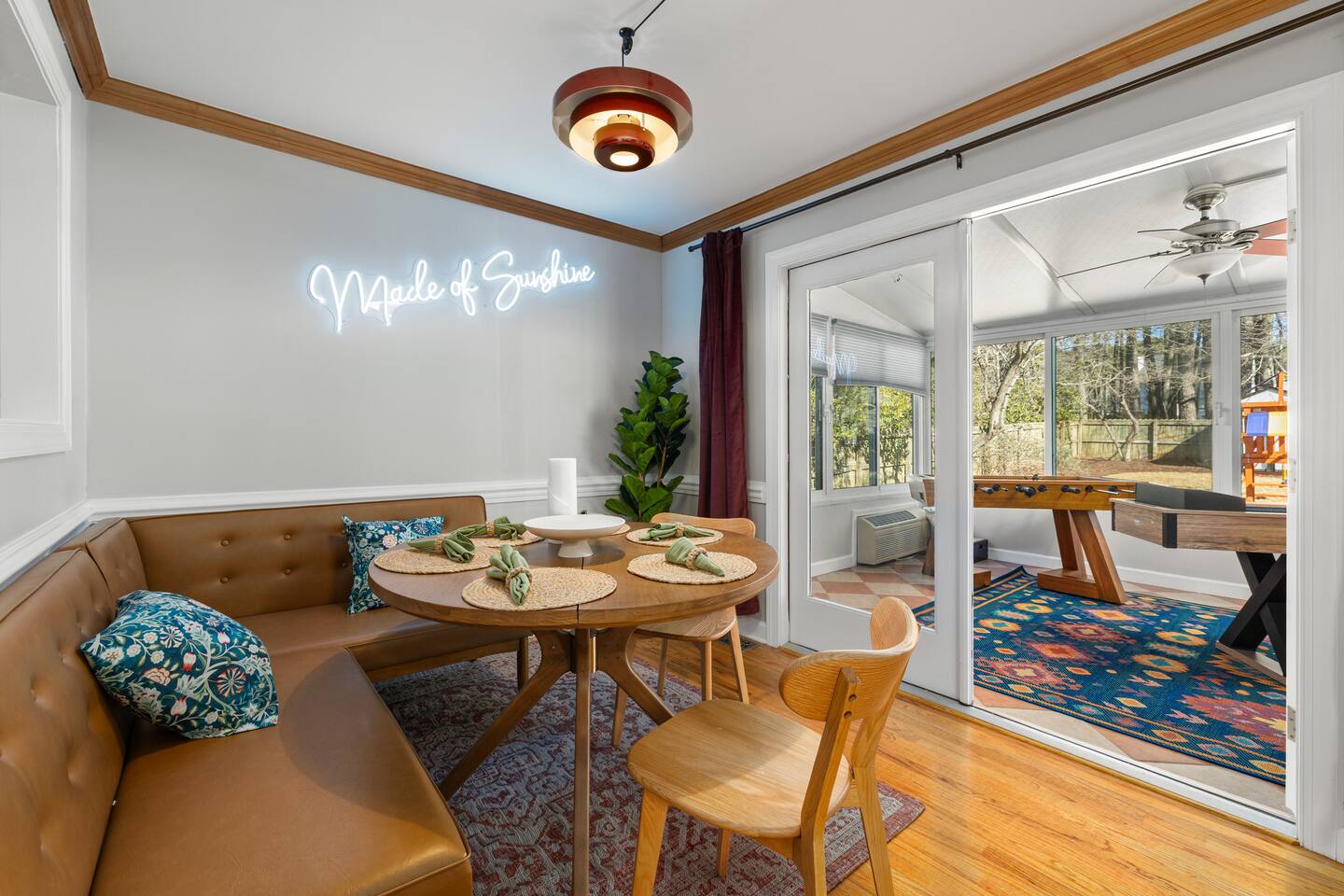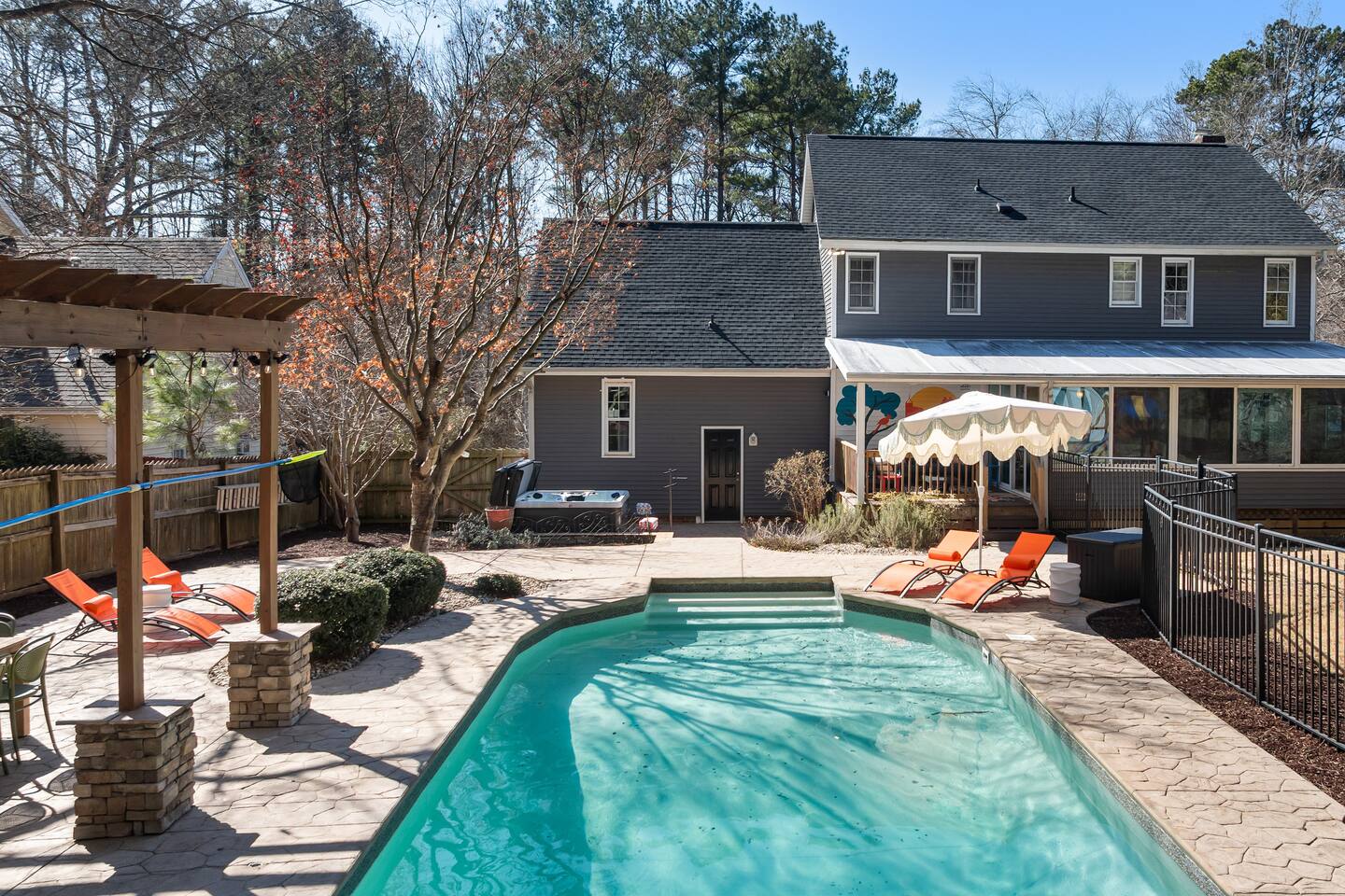 Designed with playful energy and bold personality, this North Raleigh retreat brings everyone together with a private pool, hot tub, backyard playground, cinema room, and sunlit game space. With five bedrooms and space for up to 17 guests, it’s built for group stays filled with connection, celebration, and shared moments. ⦿ Sunroom Game Room: A stunning, window-wrapped hub featuring shuffleboard, foosball, and a dedicated game table with panoramic backyard views. ⦿ Private Pool & Hot Tub: Enjoy our sparkling saltwater pool (open April through September) or the pre-heated hot tub, available year-round. Both are professionally maintained for your safety. ⦿ Home Cinema Experience: Cinematic nights featuring a 120" screen, professional JBL audio system, and a popcorn machine. ⦿ Outdoor Oasis: Includes a private playground, gazebo, fire pit, and propane grill. We provide high-quality linens, towels, soaps, detergent, and propane for your stay. ⦿ Work & Connectivity: High-speed WiFi is available throughout. A desk and chairs are located in the Master Bedroom for a quiet workspace. ⦿ Tesla EV Charging: On-site Universal Tesla Level 2 Charger (compatible with all EV models) available for $20/night. ⦿ Gourmet Living: A fully equipped chef’s kitchen, welcoming dining area, and a breakfast nook designed for group gatherings. Bed and Bath Configuration With 5 bedrooms and 2.5 bathrooms, our layout ensures everyone has a comfortable space. UPSTAIRS (2nd Floor): ⦿ Master Bedroom: King bed, ensuite bath with Jacuzzi/shower, and a private workspace. ⦿ Bedroom 2 & 3: Each features a comfortable Queen bed. ⦿ Bedroom 4: Full-over-Full bunk bed with trundle (sleeps up to 5). ⦿ Bedroom 5: Three Full beds (sleeps up to 6). ⦿ Common Bath: Full bathroom in the hallway with a shower and tub. DOWNSTAIRS (1st Floor): ⦿ Half Bath: Conveniently located near the living, cinema, and game areas.