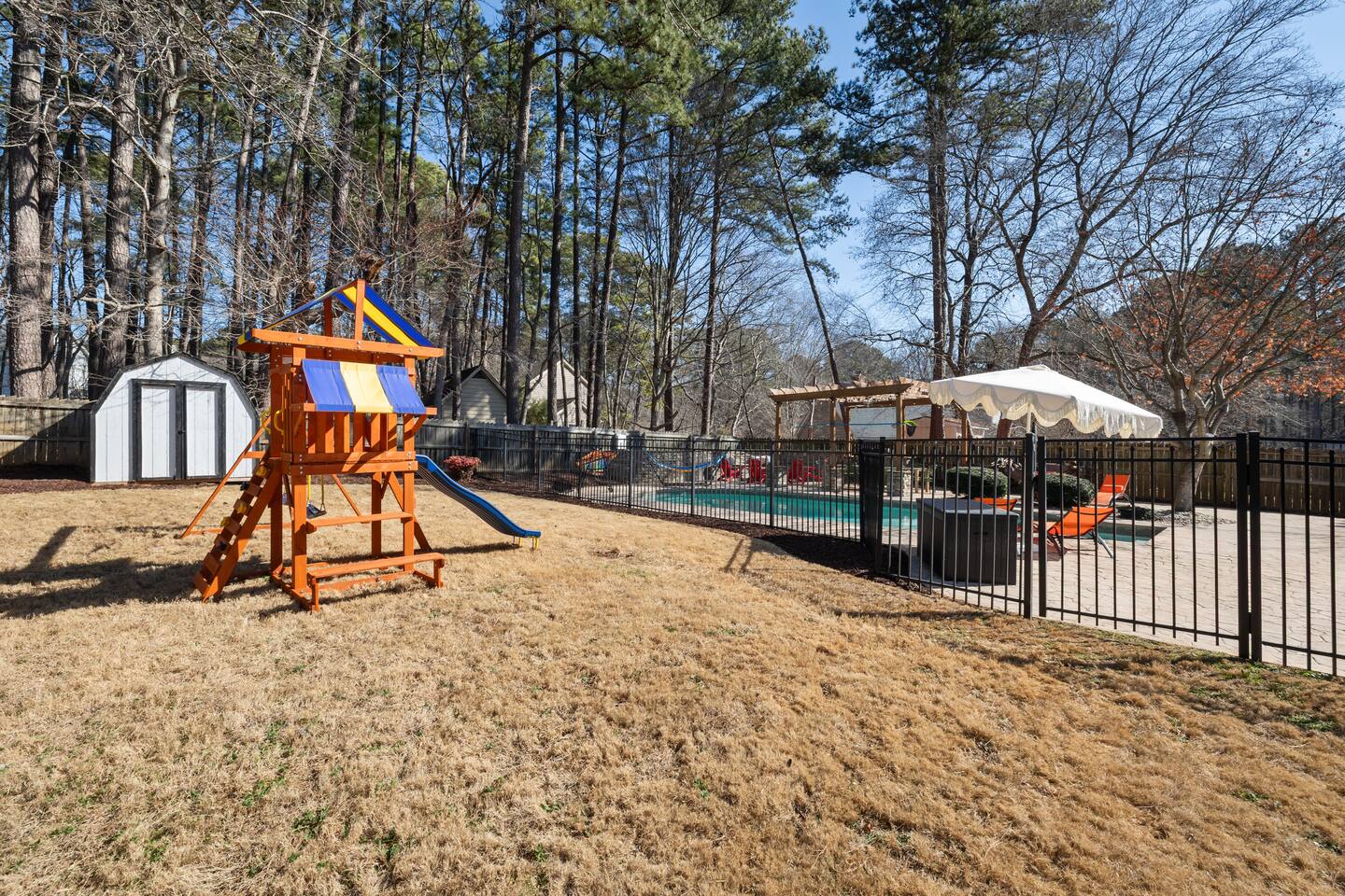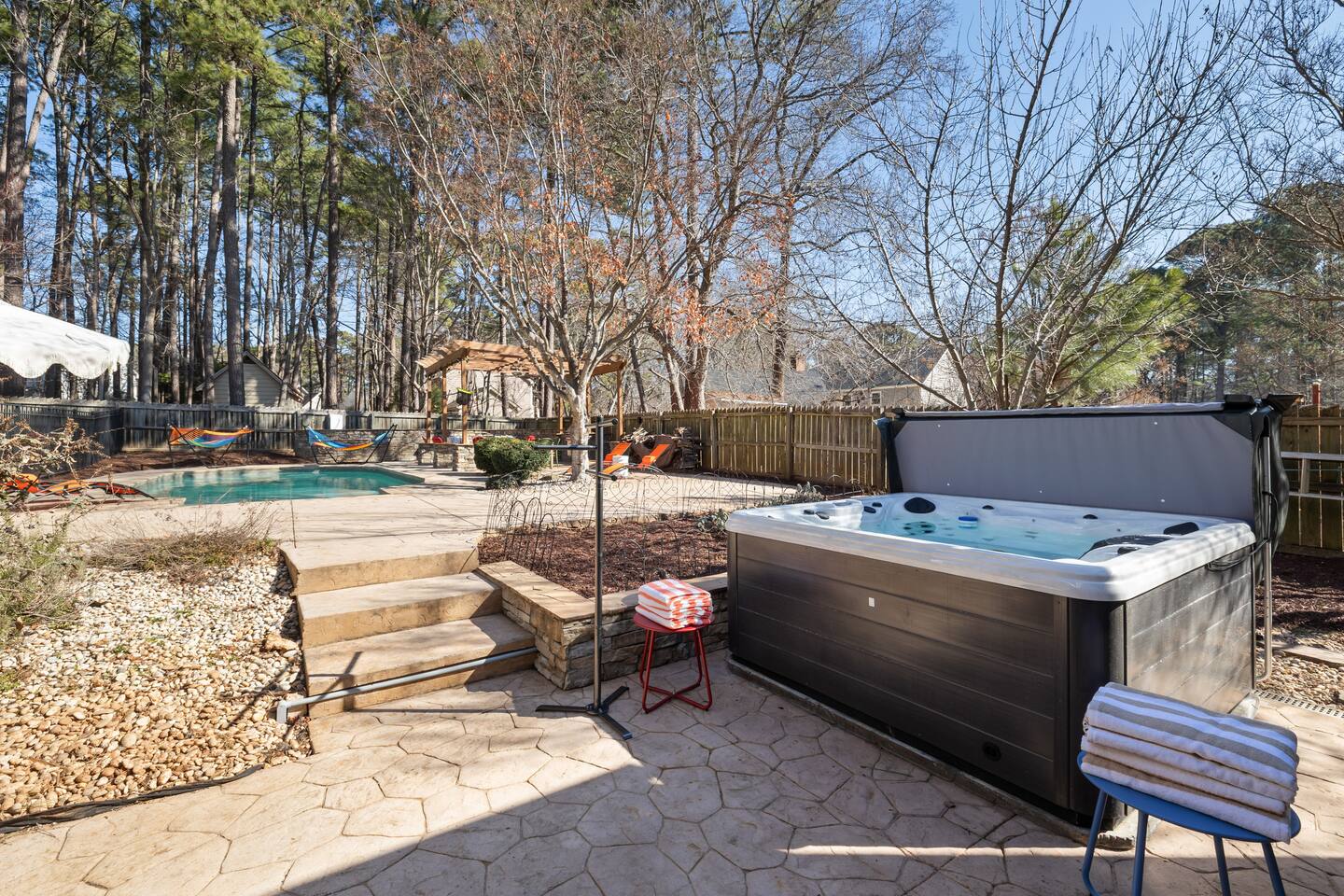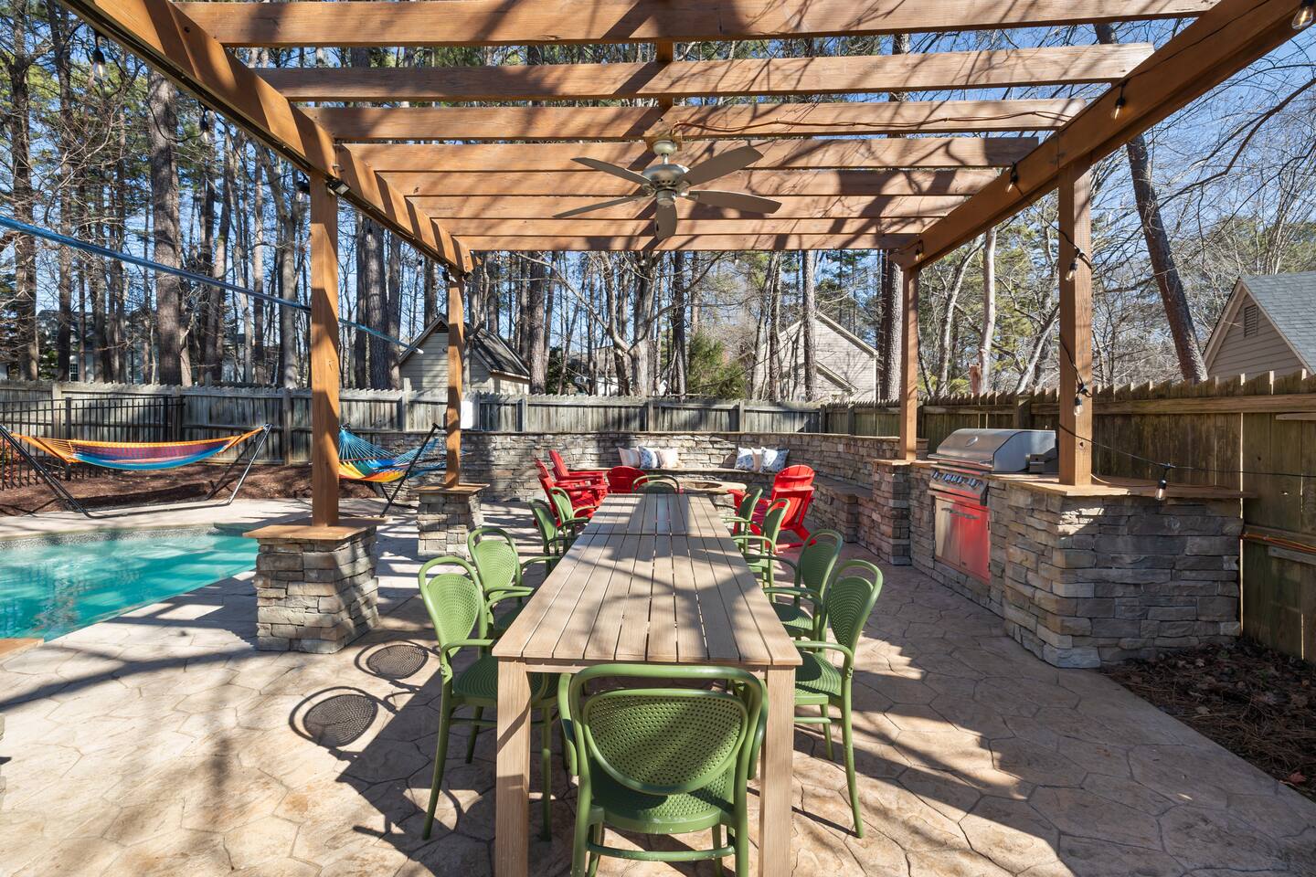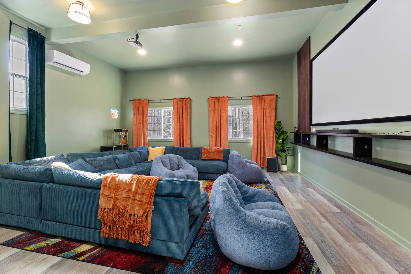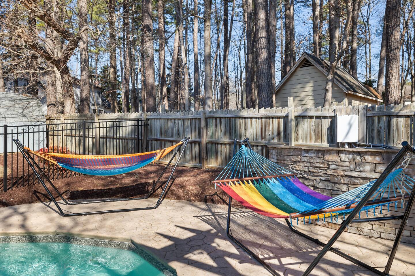 Designed with playful energy and bold personality, this North Raleigh retreat brings everyone together with a private pool, hot tub, backyard playground, cinema room, and sunlit game space. With five bedrooms and space for up to 17 guests, it’s built for group stays filled with connection, celebration, and shared moments. ⦿ Sunroom Game Room: A stunning, window-wrapped hub featuring shuffleboard, foosball, and a dedicated game table with panoramic backyard views. ⦿ Private Pool & Hot Tub: Enjoy our sparkling saltwater pool (open April through September) or the pre-heated hot tub, available year-round. Both are professionally maintained for your safety. ⦿ Home Cinema Experience: Cinematic nights featuring a 120" screen, professional JBL audio system, and a popcorn machine. ⦿ Outdoor Oasis: Includes a private playground, gazebo, fire pit, and propane grill. We provide high-quality linens, towels, soaps, detergent, and propane for your stay. ⦿ Work & Connectivity: High-speed WiFi is available throughout. A desk and chairs are located in the Master Bedroom for a quiet workspace. ⦿ Tesla EV Charging: On-site Universal Tesla Level 2 Charger (compatible with all EV models) available for $20/night. ⦿ Gourmet Living: A fully equipped chef’s kitchen, welcoming dining area, and a breakfast nook designed for group gatherings. Bed and Bath Configuration With 5 bedrooms and 2.5 bathrooms, our layout ensures everyone has a comfortable space. UPSTAIRS (2nd Floor): ⦿ Master Bedroom: King bed, ensuite bath with Jacuzzi/shower, and a private workspace. ⦿ Bedroom 2 & 3: Each features a comfortable Queen bed. ⦿ Bedroom 4: Full-over-Full bunk bed with trundle (sleeps up to 5). ⦿ Bedroom 5: Three Full beds (sleeps up to 6). ⦿ Common Bath: Full bathroom in the hallway with a shower and tub. DOWNSTAIRS (1st Floor): ⦿ Half Bath: Conveniently located near the living, cinema, and game areas.