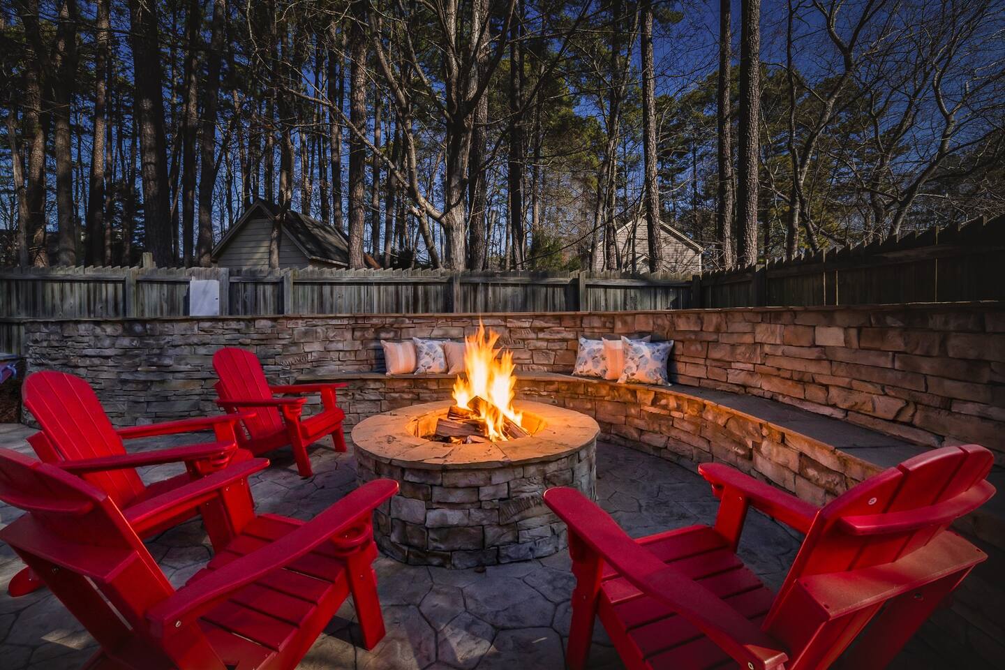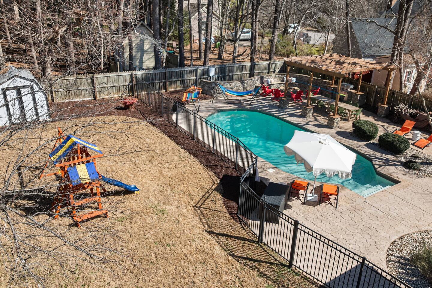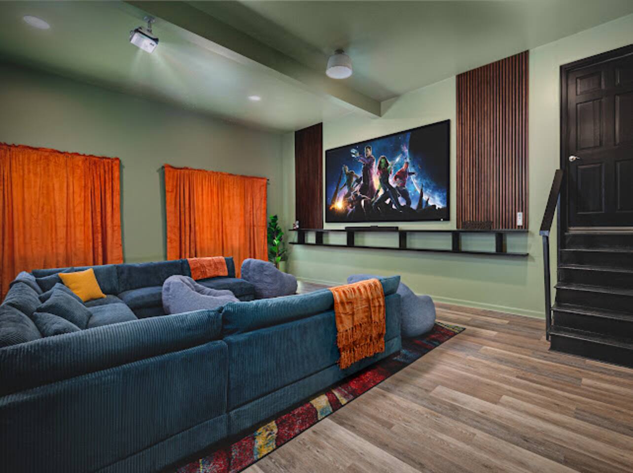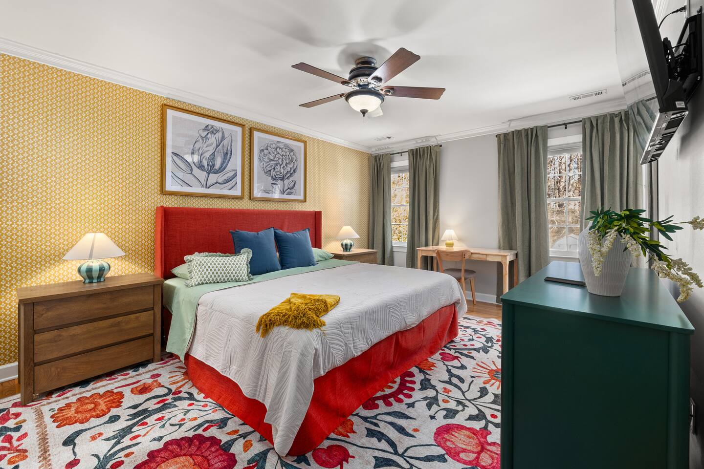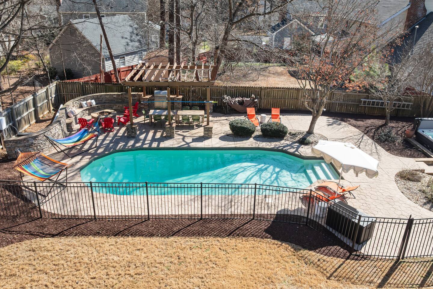 Designed with playful energy and bold personality, this North Raleigh retreat brings everyone together with a private pool, hot tub, backyard playground, cinema room, and sunlit game space. With five bedrooms and space for up to 17 guests, it’s built for group stays filled with connection, celebration, and shared moments. ⦿ Sunroom Game Room: A stunning, window-wrapped hub featuring shuffleboard, foosball, and a dedicated game table with panoramic backyard views. ⦿ Private Pool & Hot Tub: Enjoy our sparkling saltwater pool (open April through September) or the pre-heated hot tub, available year-round. Both are professionally maintained for your safety. ⦿ Home Cinema Experience: Cinematic nights featuring a 120" screen, professional JBL audio system, and a popcorn machine. ⦿ Outdoor Oasis: Includes a private playground, gazebo, fire pit, and propane grill. We provide high-quality linens, towels, soaps, detergent, and propane for your stay. ⦿ Work & Connectivity: High-speed WiFi is available throughout. A desk and chairs are located in the Master Bedroom for a quiet workspace. ⦿ Tesla EV Charging: On-site Universal Tesla Level 2 Charger (compatible with all EV models) available for $20/night. ⦿ Gourmet Living: A fully equipped chef’s kitchen, welcoming dining area, and a breakfast nook designed for group gatherings. Bed and Bath Configuration With 5 bedrooms and 2.5 bathrooms, our layout ensures everyone has a comfortable space. UPSTAIRS (2nd Floor): ⦿ Master Bedroom: King bed, ensuite bath with Jacuzzi/shower, and a private workspace. ⦿ Bedroom 2 & 3: Each features a comfortable Queen bed. ⦿ Bedroom 4: Full-over-Full bunk bed with trundle (sleeps up to 5). ⦿ Bedroom 5: Three Full beds (sleeps up to 6). ⦿ Common Bath: Full bathroom in the hallway with a shower and tub. DOWNSTAIRS (1st Floor): ⦿ Half Bath: Conveniently located near the living, cinema, and game areas.