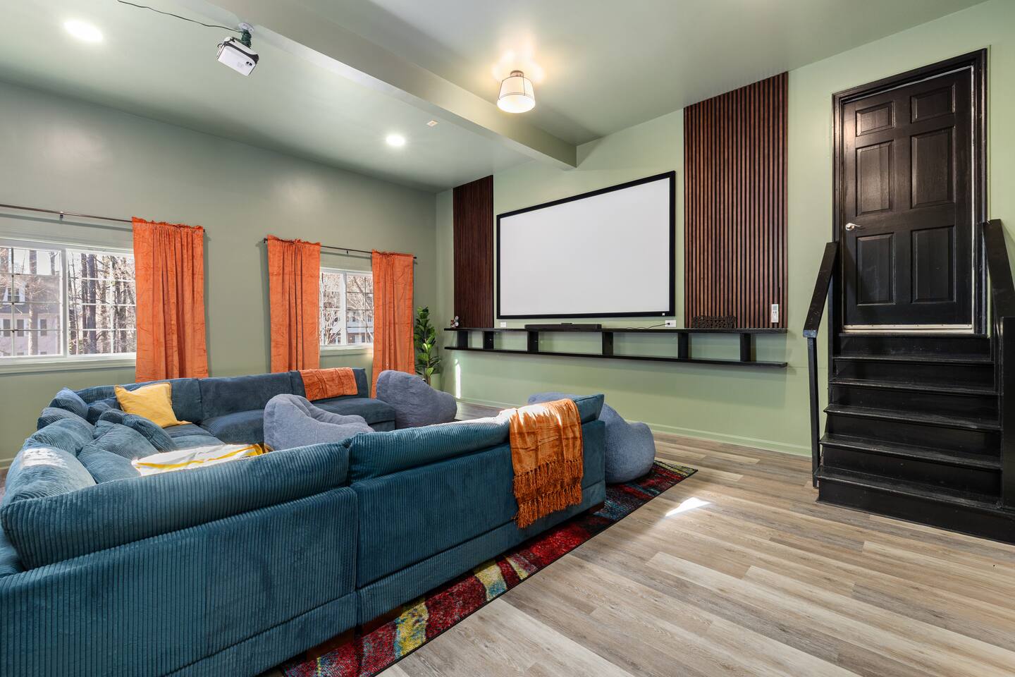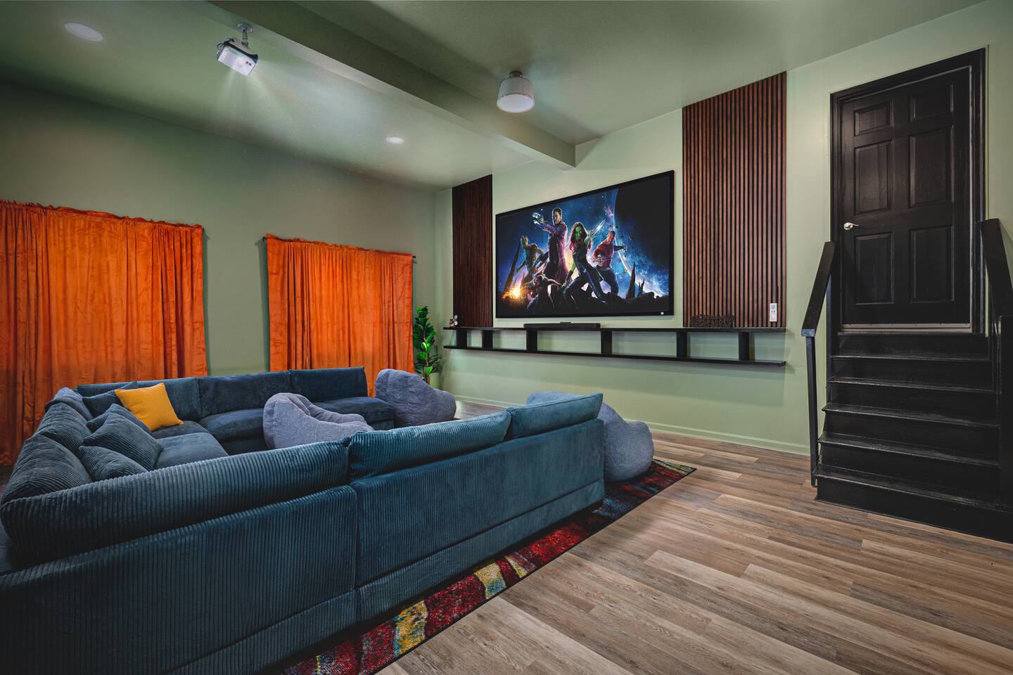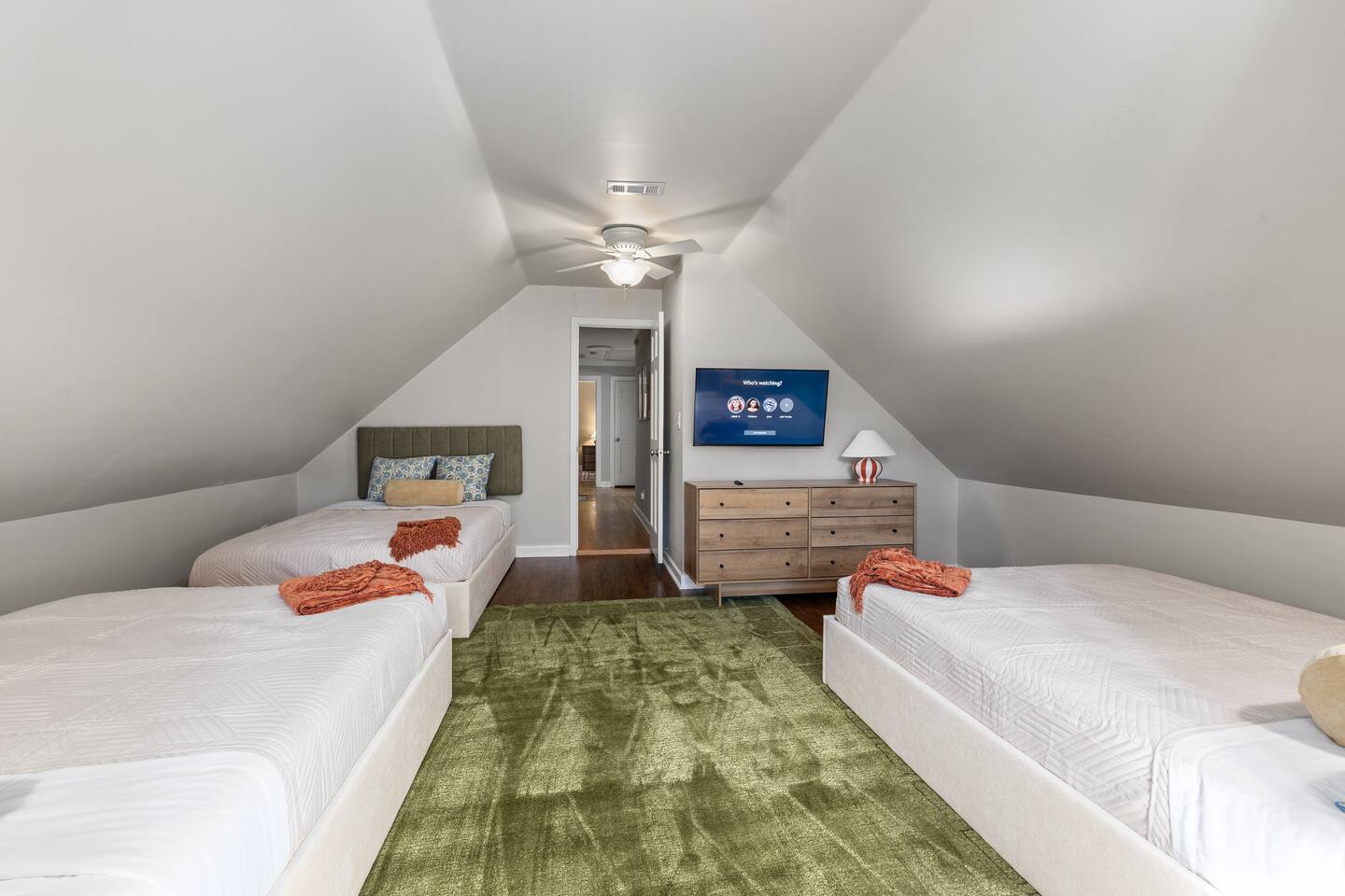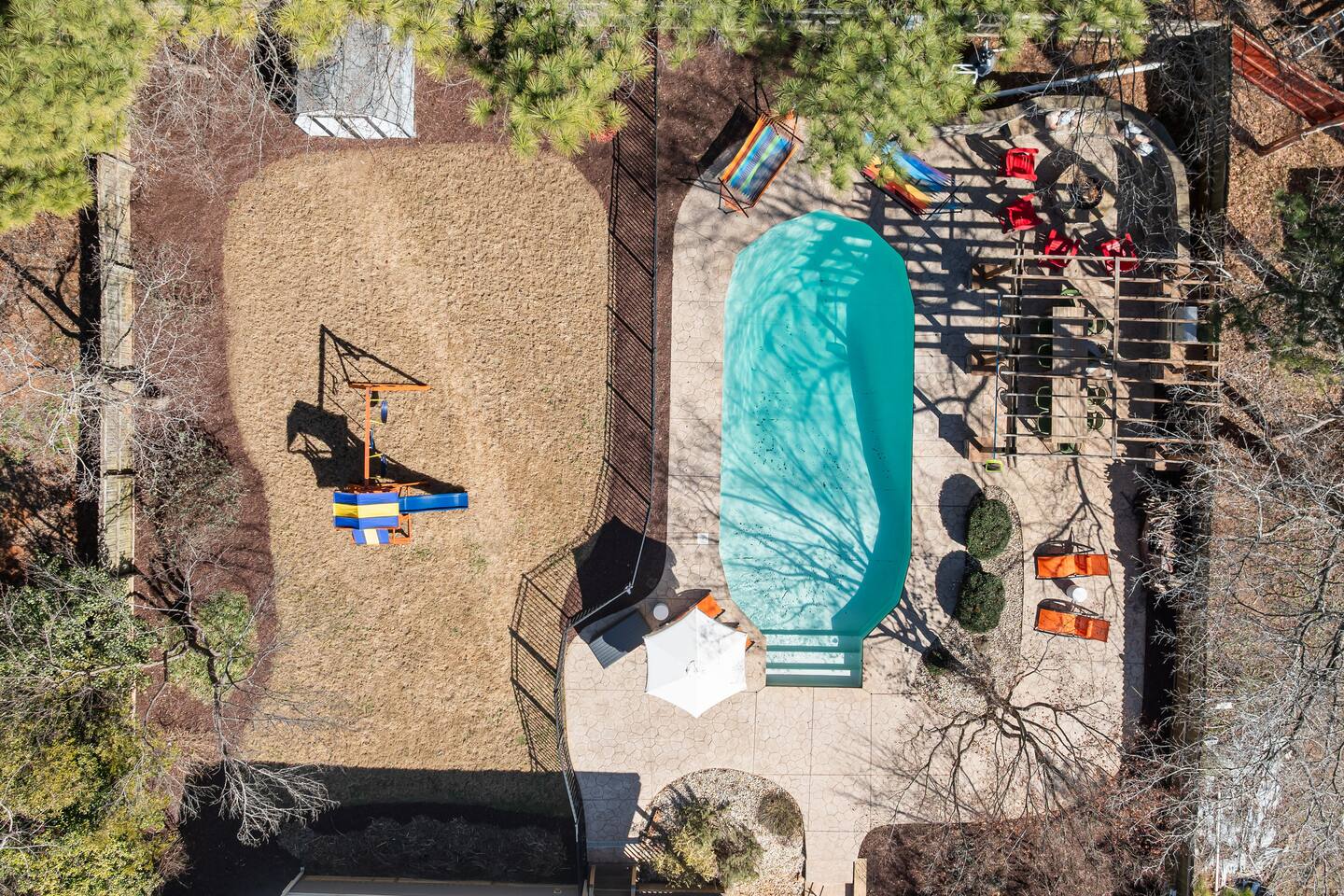 Designed with playful energy and bold personality, this North Raleigh retreat brings everyone together with a private pool, hot tub, backyard playground, cinema room, and sunlit game space. With five bedrooms and space for up to 17 guests, it’s built for group stays filled with connection, celebration, and shared moments. ⦿ Sunroom Game Room: A stunning, window-wrapped hub featuring shuffleboard, foosball, and a dedicated game table with panoramic backyard views. ⦿ Private Pool & Hot Tub: Enjoy our sparkling saltwater pool (open April through September) or the pre-heated hot tub, available year-round. Both are professionally maintained for your safety. ⦿ Home Cinema Experience: Cinematic nights featuring a 120" screen, professional JBL audio system, and a popcorn machine. ⦿ Outdoor Oasis: Includes a private playground, gazebo, fire pit, and propane grill. We provide high-quality linens, towels, soaps, detergent, and propane for your stay. ⦿ Work & Connectivity: High-speed WiFi is available throughout. A desk and chairs are located in the Master Bedroom for a quiet workspace. ⦿ Tesla EV Charging: On-site Universal Tesla Level 2 Charger (compatible with all EV models) available for $20/night. ⦿ Gourmet Living: A fully equipped chef’s kitchen, welcoming dining area, and a breakfast nook designed for group gatherings. Bed and Bath Configuration With 5 bedrooms and 2.5 bathrooms, our layout ensures everyone has a comfortable space. UPSTAIRS (2nd Floor): ⦿ Master Bedroom: King bed, ensuite bath with Jacuzzi/shower, and a private workspace. ⦿ Bedroom 2 & 3: Each features a comfortable Queen bed. ⦿ Bedroom 4: Full-over-Full bunk bed with trundle (sleeps up to 5). ⦿ Bedroom 5: Three Full beds (sleeps up to 6). ⦿ Common Bath: Full bathroom in the hallway with a shower and tub. DOWNSTAIRS (1st Floor): ⦿ Half Bath: Conveniently located near the living, cinema, and game areas.