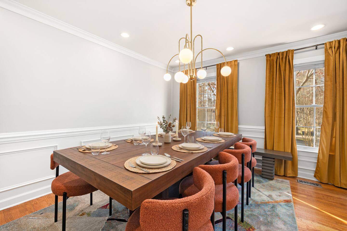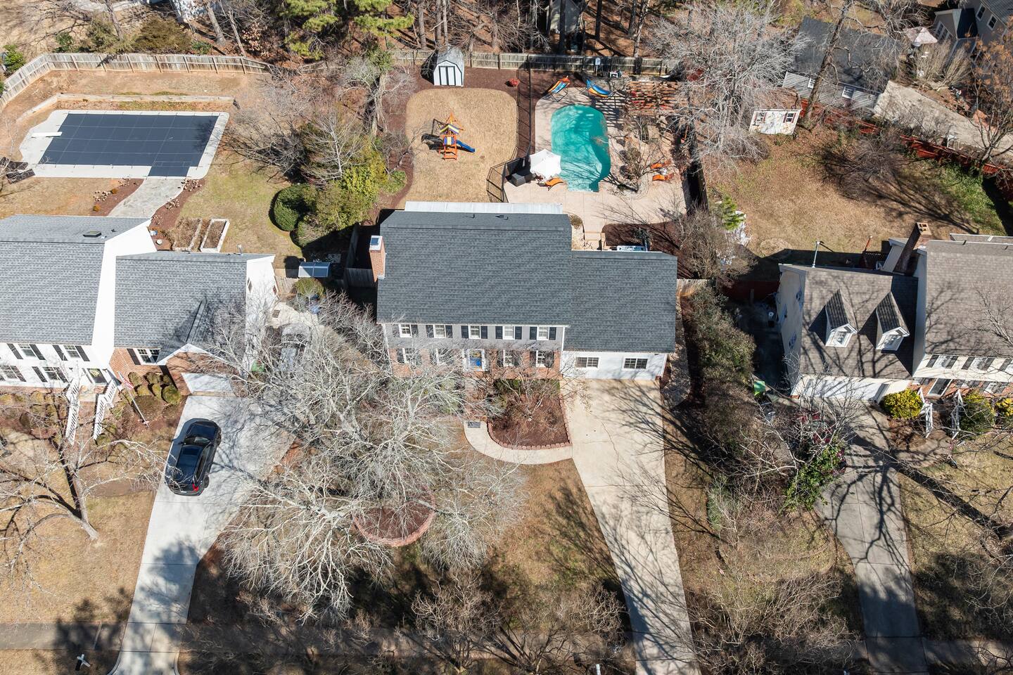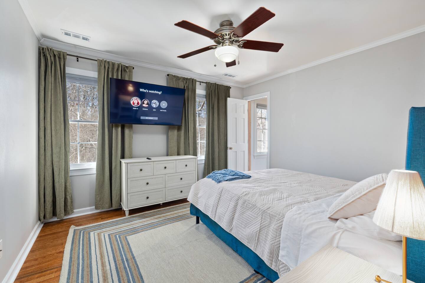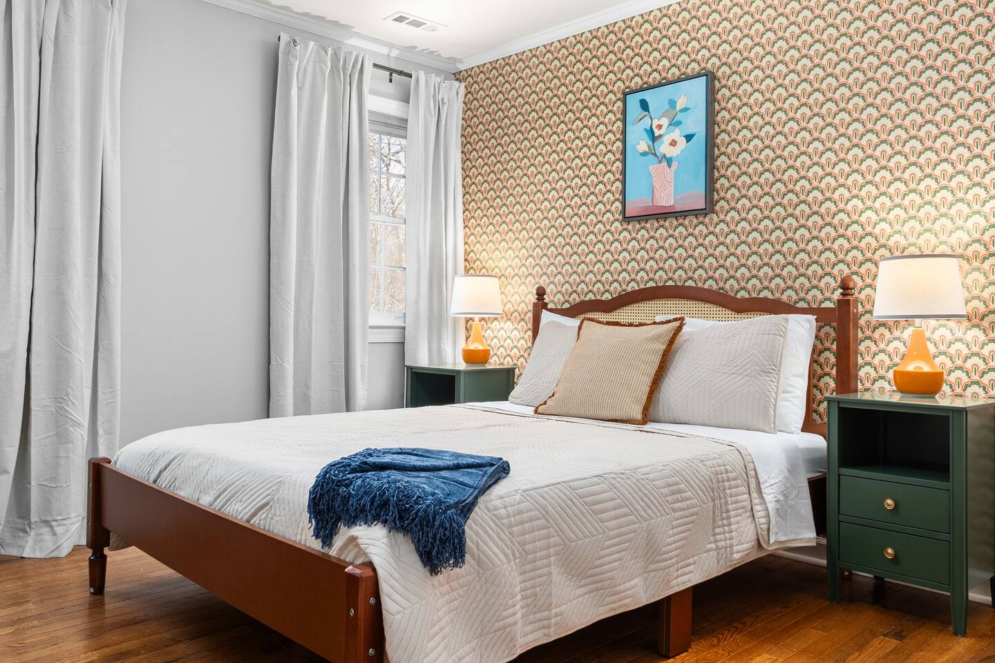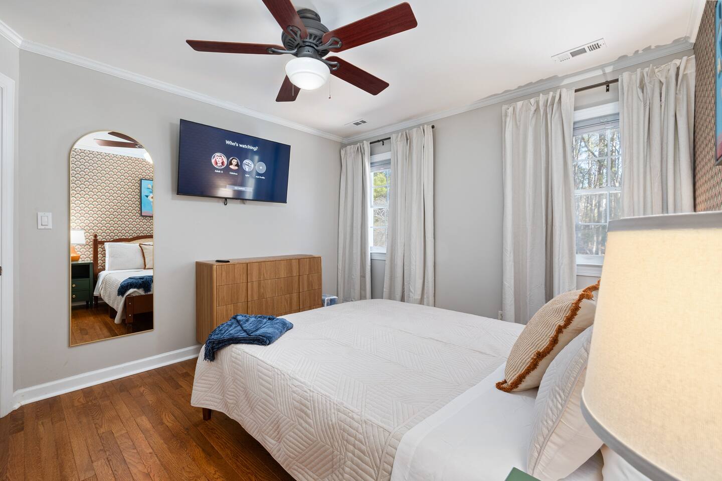 Designed with playful energy and bold personality, this North Raleigh retreat brings everyone together with a private pool, hot tub, backyard playground, cinema room, and sunlit game space. With five bedrooms and space for up to 17 guests, it’s built for group stays filled with connection, celebration, and shared moments. ⦿ Sunroom Game Room: A stunning, window-wrapped hub featuring shuffleboard, foosball, and a dedicated game table with panoramic backyard views. ⦿ Private Pool & Hot Tub: Enjoy our sparkling saltwater pool (open April through September) or the pre-heated hot tub, available year-round. Both are professionally maintained for your safety. ⦿ Home Cinema Experience: Cinematic nights featuring a 120" screen, professional JBL audio system, and a popcorn machine. ⦿ Outdoor Oasis: Includes a private playground, gazebo, fire pit, and propane grill. We provide high-quality linens, towels, soaps, detergent, and propane for your stay. ⦿ Work & Connectivity: High-speed WiFi is available throughout. A desk and chairs are located in the Master Bedroom for a quiet workspace. ⦿ Tesla EV Charging: On-site Universal Tesla Level 2 Charger (compatible with all EV models) available for $20/night. ⦿ Gourmet Living: A fully equipped chef’s kitchen, welcoming dining area, and a breakfast nook designed for group gatherings. Bed and Bath Configuration With 5 bedrooms and 2.5 bathrooms, our layout ensures everyone has a comfortable space. UPSTAIRS (2nd Floor): ⦿ Master Bedroom: King bed, ensuite bath with Jacuzzi/shower, and a private workspace. ⦿ Bedroom 2 & 3: Each features a comfortable Queen bed. ⦿ Bedroom 4: Full-over-Full bunk bed with trundle (sleeps up to 5). ⦿ Bedroom 5: Three Full beds (sleeps up to 6). ⦿ Common Bath: Full bathroom in the hallway with a shower and tub. DOWNSTAIRS (1st Floor): ⦿ Half Bath: Conveniently located near the living, cinema, and game areas.