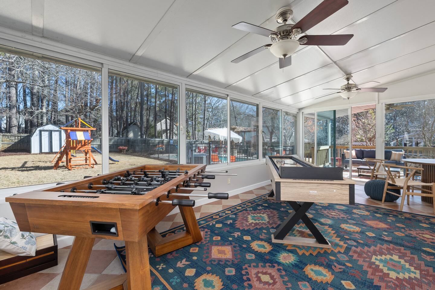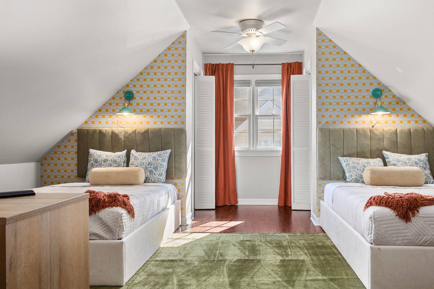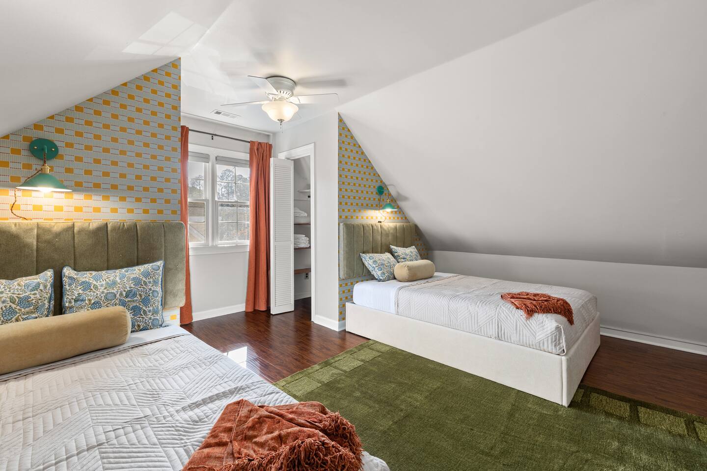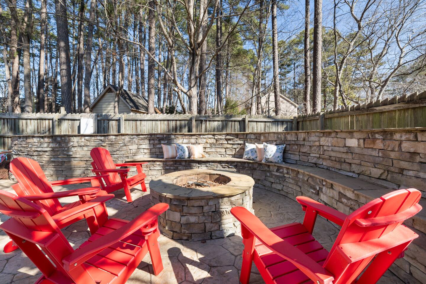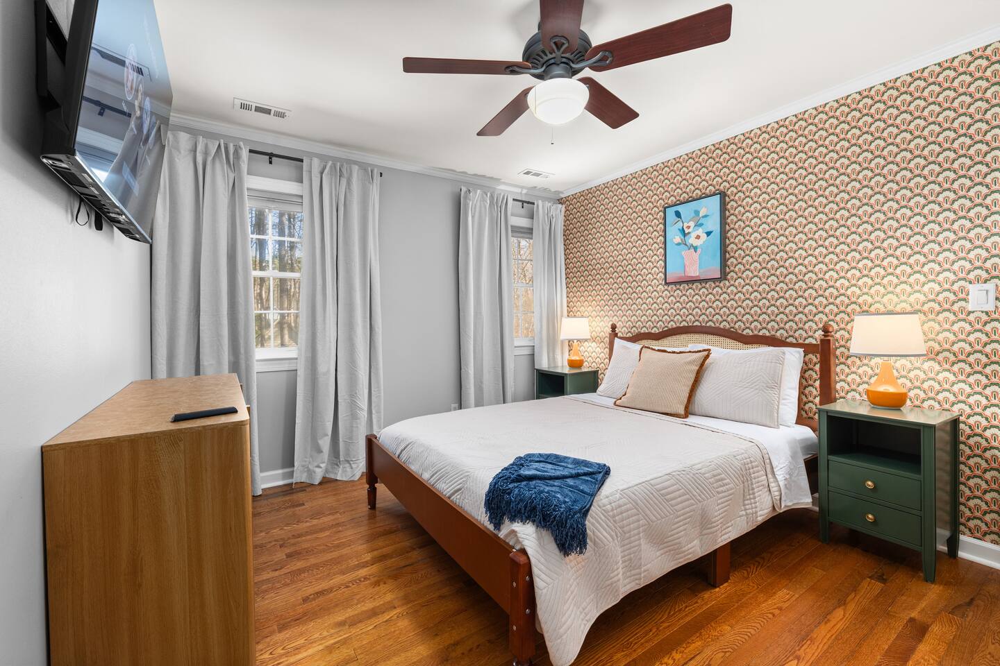 Designed with playful energy and bold personality, this North Raleigh retreat brings everyone together with a private pool, hot tub, backyard playground, cinema room, and sunlit game space. With five bedrooms and space for up to 17 guests, it’s built for group stays filled with connection, celebration, and shared moments. ⦿ Sunroom Game Room: A stunning, window-wrapped hub featuring shuffleboard, foosball, and a dedicated game table with panoramic backyard views. ⦿ Private Pool & Hot Tub: Enjoy our sparkling saltwater pool (open April through September) or the pre-heated hot tub, available year-round. Both are professionally maintained for your safety. ⦿ Home Cinema Experience: Cinematic nights featuring a 120" screen, professional JBL audio system, and a popcorn machine. ⦿ Outdoor Oasis: Includes a private playground, gazebo, fire pit, and propane grill. We provide high-quality linens, towels, soaps, detergent, and propane for your stay. ⦿ Work & Connectivity: High-speed WiFi is available throughout. A desk and chairs are located in the Master Bedroom for a quiet workspace. ⦿ Tesla EV Charging: On-site Universal Tesla Level 2 Charger (compatible with all EV models) available for $20/night. ⦿ Gourmet Living: A fully equipped chef’s kitchen, welcoming dining area, and a breakfast nook designed for group gatherings. Bed and Bath Configuration With 5 bedrooms and 2.5 bathrooms, our layout ensures everyone has a comfortable space. UPSTAIRS (2nd Floor): ⦿ Master Bedroom: King bed, ensuite bath with Jacuzzi/shower, and a private workspace. ⦿ Bedroom 2 & 3: Each features a comfortable Queen bed. ⦿ Bedroom 4: Full-over-Full bunk bed with trundle (sleeps up to 5). ⦿ Bedroom 5: Three Full beds (sleeps up to 6). ⦿ Common Bath: Full bathroom in the hallway with a shower and tub. DOWNSTAIRS (1st Floor): ⦿ Half Bath: Conveniently located near the living, cinema, and game areas.
