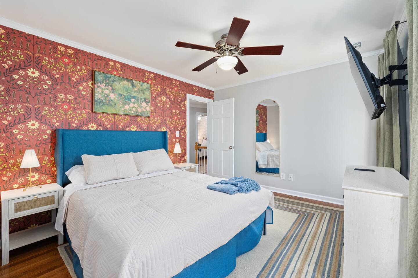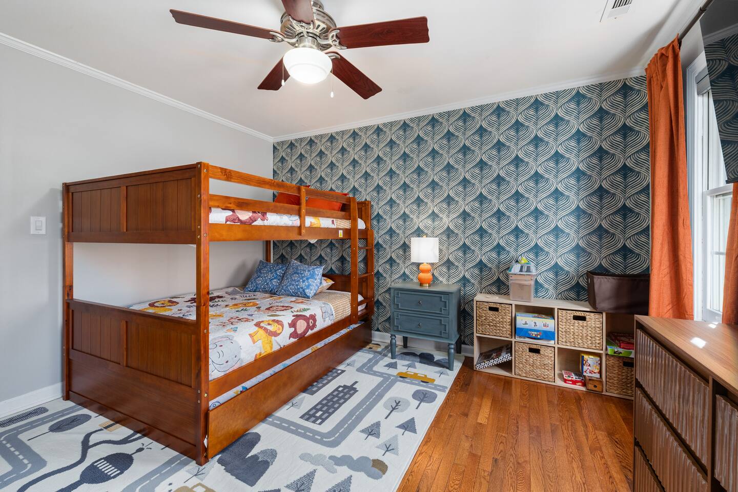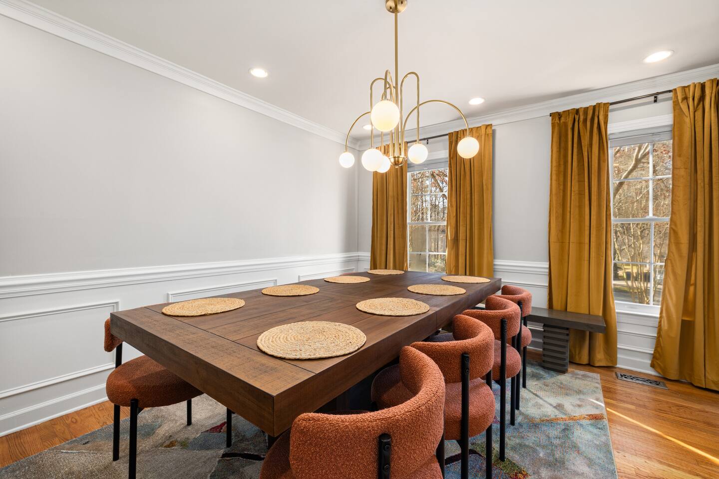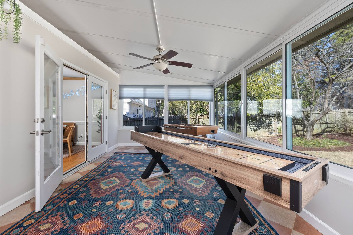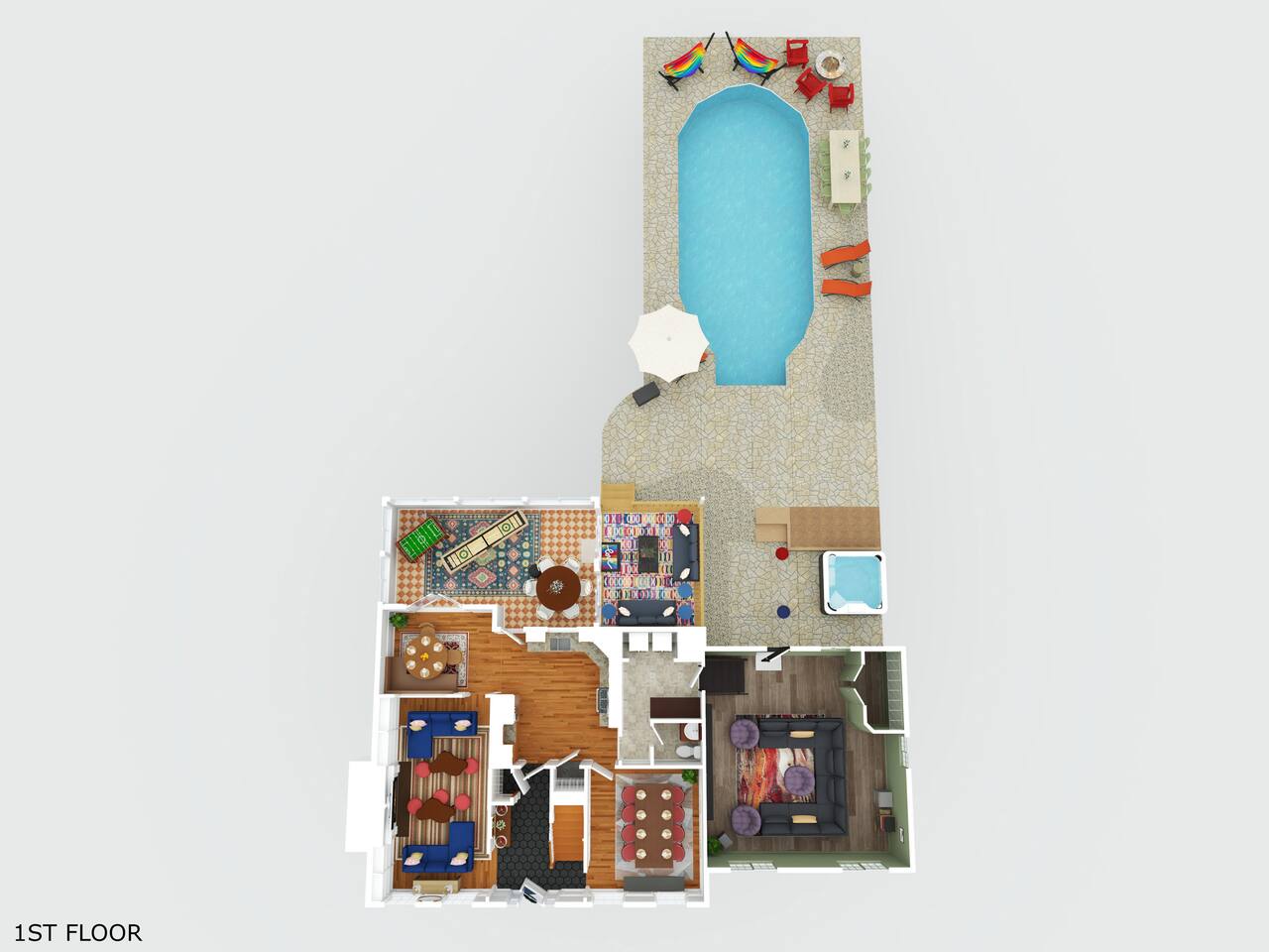 Designed with playful energy and bold personality, this North Raleigh retreat brings everyone together with a private pool, hot tub, backyard playground, cinema room, and sunlit game space. With five bedrooms and space for up to 17 guests, it’s built for group stays filled with connection, celebration, and shared moments. ⦿ Sunroom Game Room: A stunning, window-wrapped hub featuring shuffleboard, foosball, and a dedicated game table with panoramic backyard views. ⦿ Private Pool & Hot Tub: Enjoy our sparkling saltwater pool (open April through September) or the pre-heated hot tub, available year-round. Both are professionally maintained for your safety. ⦿ Home Cinema Experience: Cinematic nights featuring a 120" screen, professional JBL audio system, and a popcorn machine. ⦿ Outdoor Oasis: Includes a private playground, gazebo, fire pit, and propane grill. We provide high-quality linens, towels, soaps, detergent, and propane for your stay. ⦿ Work & Connectivity: High-speed WiFi is available throughout. A desk and chairs are located in the Master Bedroom for a quiet workspace. ⦿ Tesla EV Charging: On-site Universal Tesla Level 2 Charger (compatible with all EV models) available for $20/night. ⦿ Gourmet Living: A fully equipped chef’s kitchen, welcoming dining area, and a breakfast nook designed for group gatherings. Bed and Bath Configuration With 5 bedrooms and 2.5 bathrooms, our layout ensures everyone has a comfortable space. UPSTAIRS (2nd Floor): ⦿ Master Bedroom: King bed, ensuite bath with Jacuzzi/shower, and a private workspace. ⦿ Bedroom 2 & 3: Each features a comfortable Queen bed. ⦿ Bedroom 4: Full-over-Full bunk bed with trundle (sleeps up to 5). ⦿ Bedroom 5: Three Full beds (sleeps up to 6). ⦿ Common Bath: Full bathroom in the hallway with a shower and tub. DOWNSTAIRS (1st Floor): ⦿ Half Bath: Conveniently located near the living, cinema, and game areas.